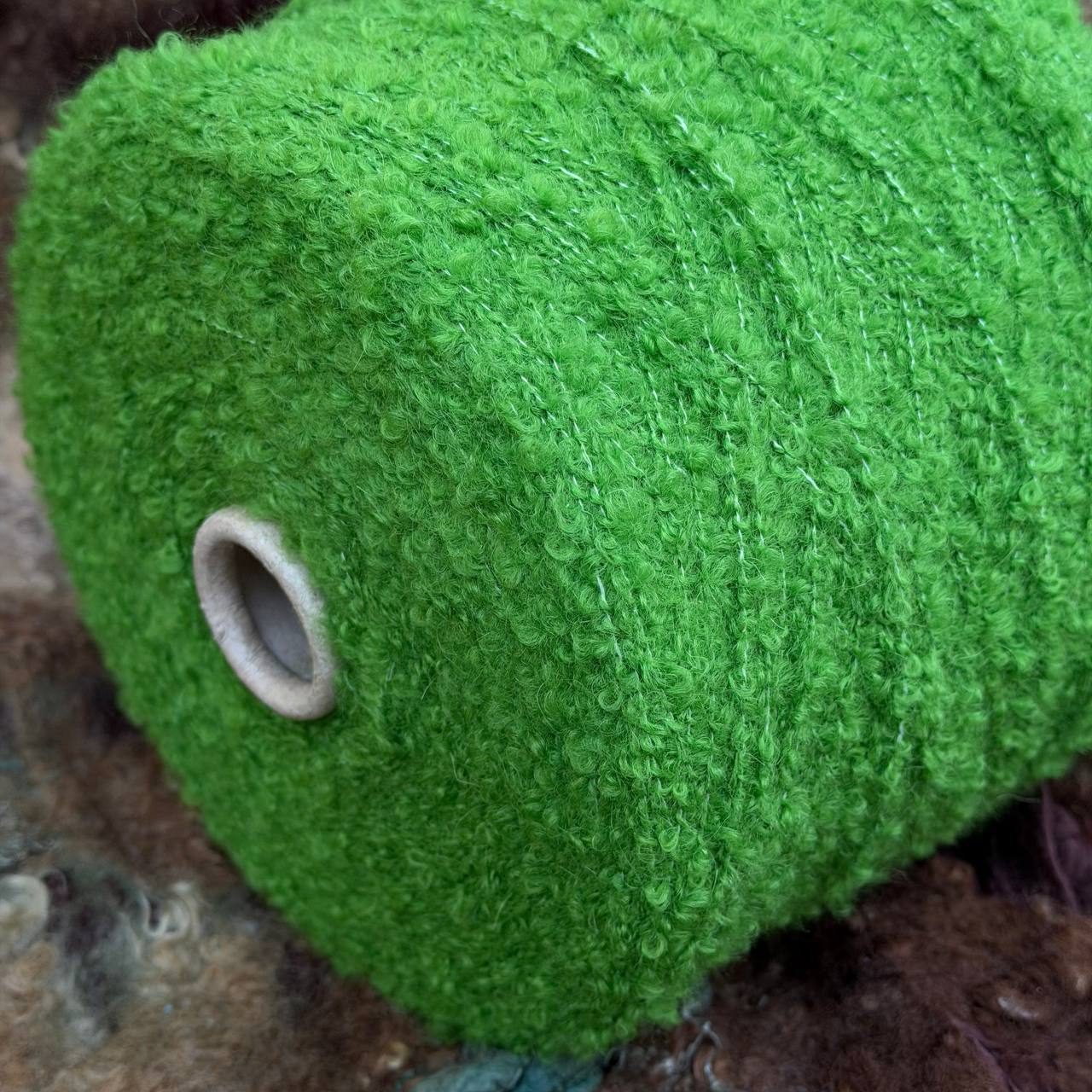 Метраж 220 м на 100 г - это уже более пластичное, не тяжёлое полотно. Объём сохраняется, но вещь остаётся комфортной по весу. Простая гладь выглядит аккуратно за счёт самой фактуры. Крупное фактурное букле с мягкой, шелковистой альпакой.