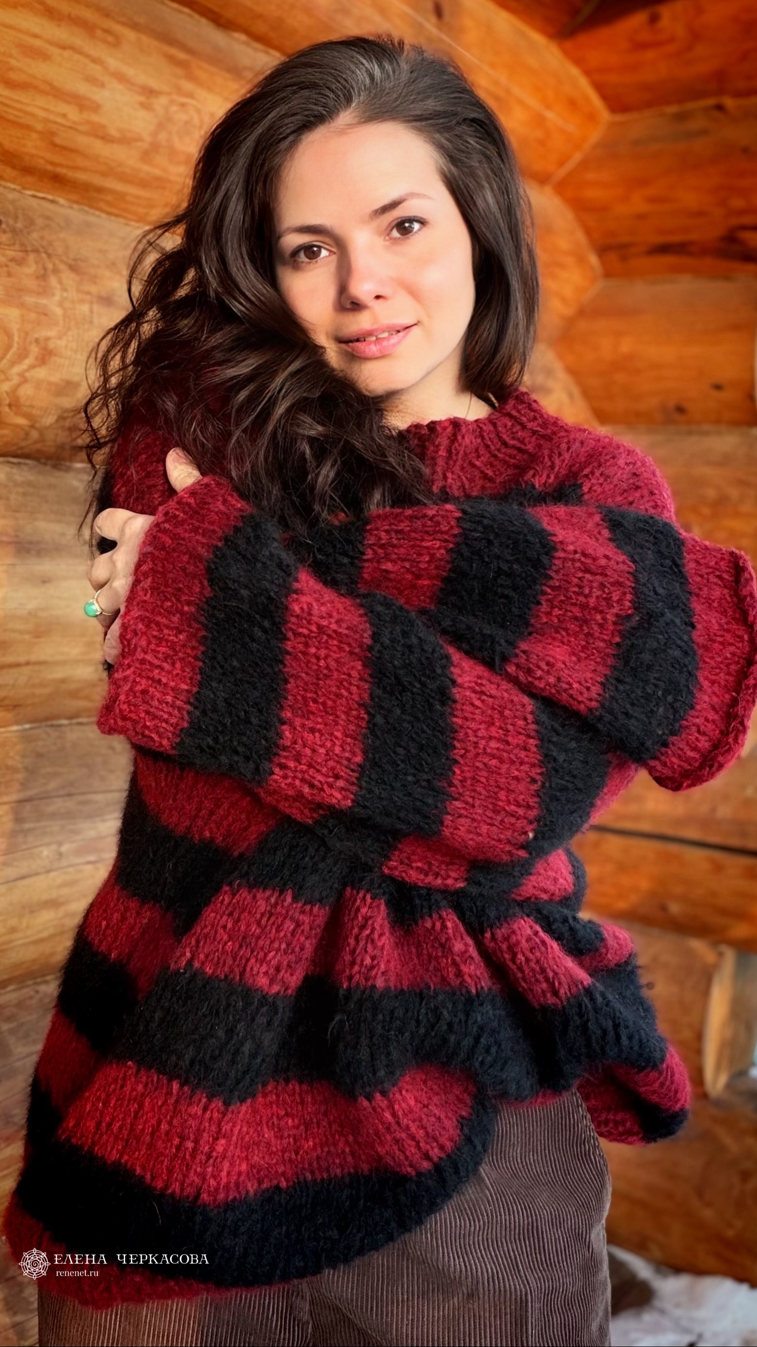 Этот свитер связан в той же эстетике. Красно-чёрная полоска, объёмный силуэт, пушистая фактура пряжи. Вещь выглядит расслабленно и живо.
