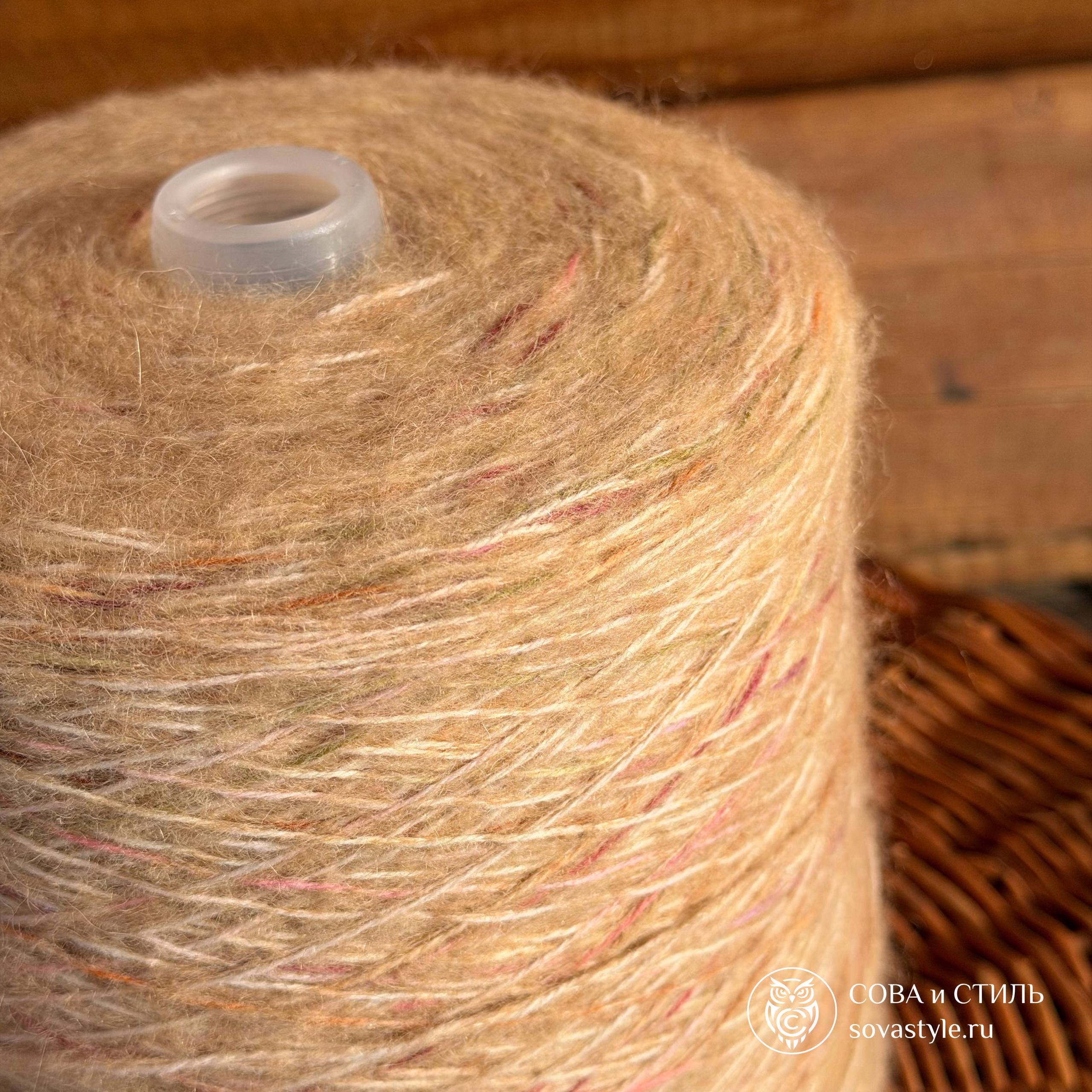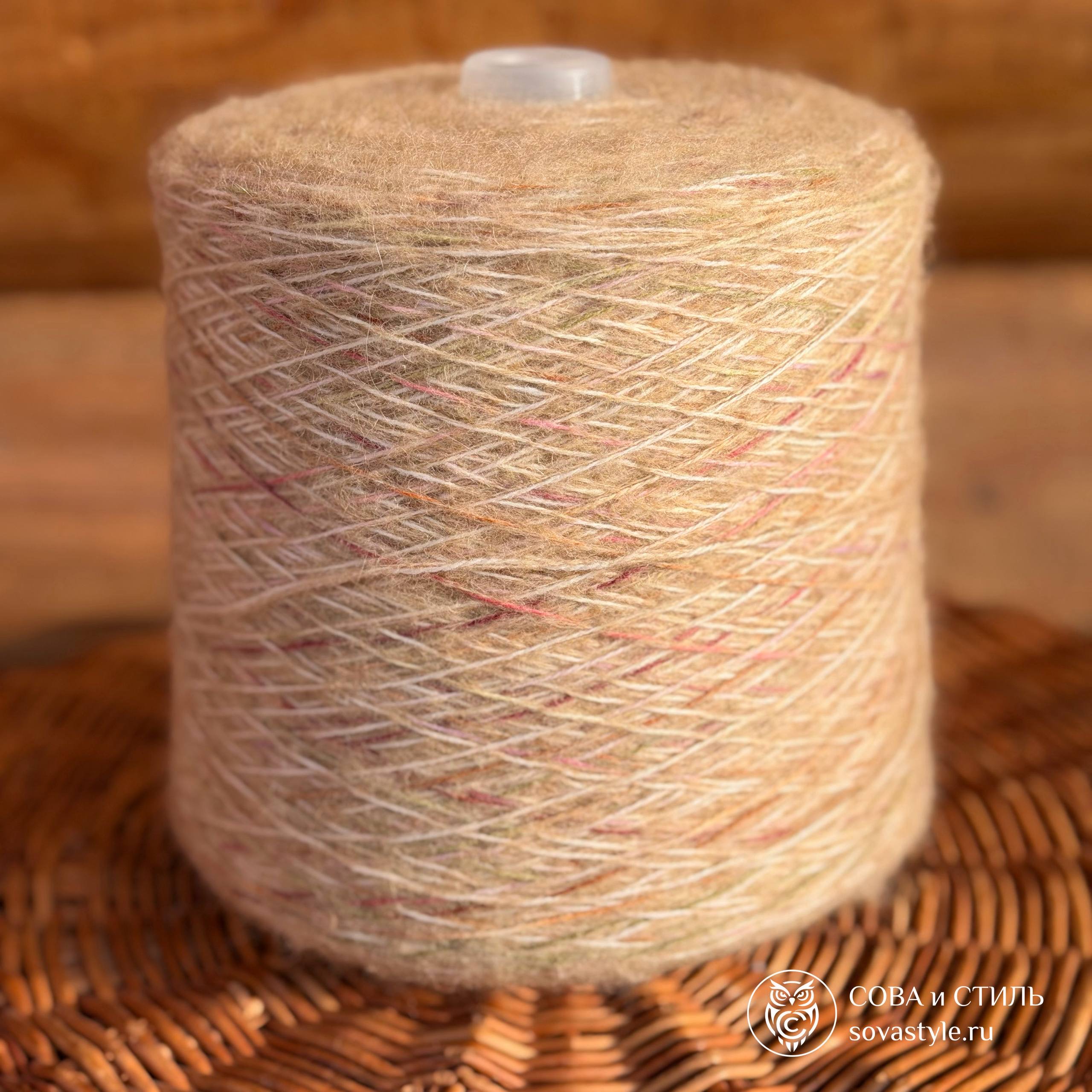 Нить скручена из двух близких оттенков, поверх проходят деликатные цветные штрихи. За счёт этого полотно выглядит живым, с мягкими переливами и глубиной.